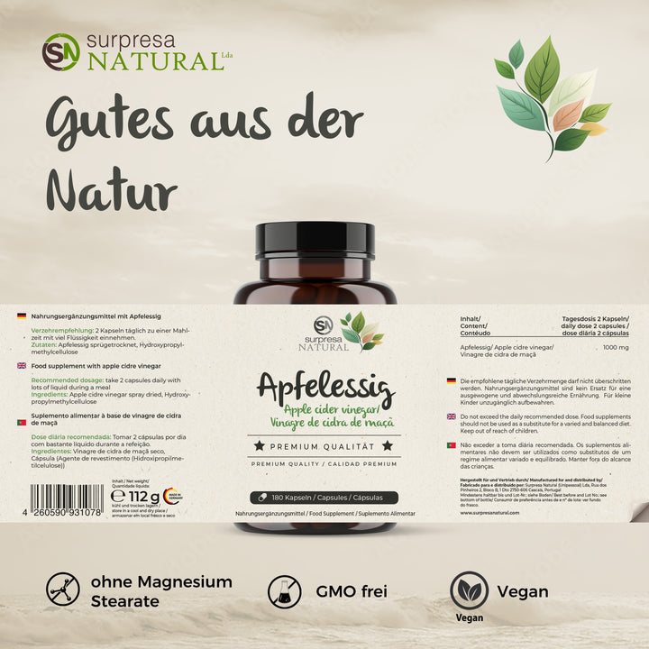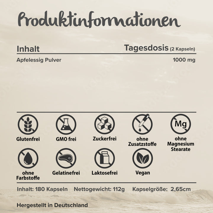 Unser Nahrungsergänzungsmittel wird unter strengen Qualitätsstandards hergestellt und getestet, um sicherzustellen, dass Sie ein Produkt von höchster Reinheit und Wirksamkeit erhalten. Wir verstehen, wie wichtig es ist, Ihrem Körper nur das Beste zu bieten, und unser Natürlicher Apfelessig in Kapselform wurde geschaffen, um diesen Anspruch zu erfüllen.