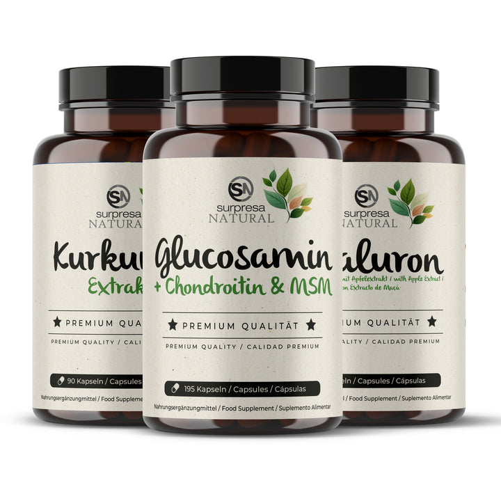 Dieses Paket kombiniert unsere beliebtesten Produkte aus der Kategorie Mobilität –zum unschlagbaren Preis. Mit unserem Kombipaket Mobilität erhalten Sie eine Dose unseres beliebten Trios "Glucosamin, Chondroitin & MSM", sowie je eine Dose Kurkuma und Hyaluronsäure. Damit holen Sie sich gleich fünf wertvolle Nährstoffe ins Haus und Leben. Näheres zur Wirkung der fünf Inhaltsstoffe lesen Sie im Folgenden: