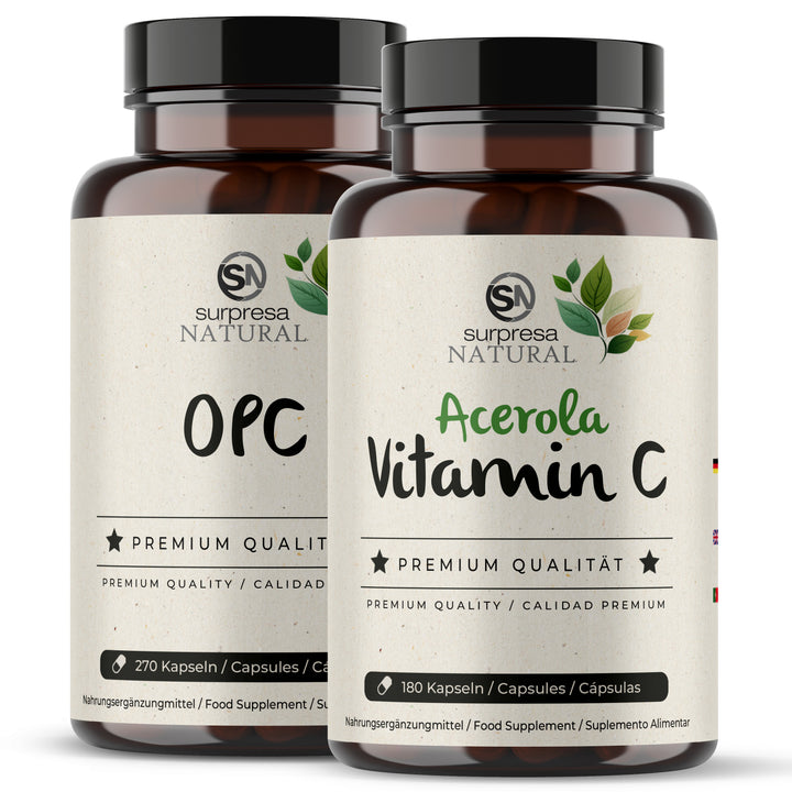 Dieses Set enthält je 1 Dose Acerola Vitamin C 180 Kapseln und 1 Dose OPC 270 Kapseln