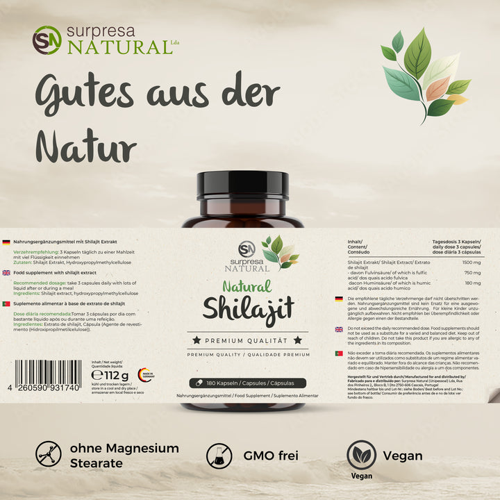 Shilajit ist ein absolutes Naturprodukt, dessen genaue Inhaltsstoffe natürlichen Schwankungen unterliegen. Daher wird das rohe Shilajit zunächst gereinigt und gefiltert, um eine hervorragende Qualität sicherzustellen. Bei Surpresa Natural-Kapseln wird besonders auf eine sorgfältige Reinigung und Verarbeitung geachtet, um sicherzustellen, dass das Endprodukt frei von Verunreinigungen ist. Jede geschmacksneutrale Kapsel enthält 500 mg hochwertiges Shilajit mit einem Fulvinsäure-Anteil von rund 50 Prozent und einem Huminsäure-Anteil von etwa 12 Prozent. Surpresa Natural-Kapseln werden in Deutschland hergestellt und regelmäßig von unabhängigen Labors getestet, um höchsten Qualitätsstandards zu entsprechen.